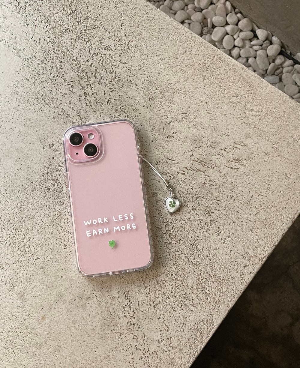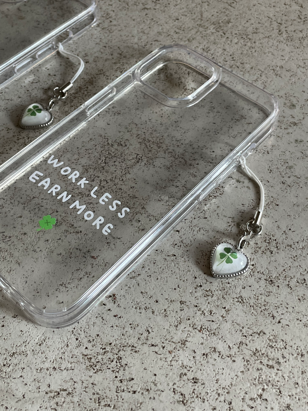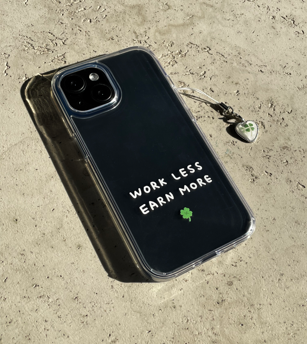 적게 일하고 많이 버세요..! WORK LESS EARN MORE 케이스와 하트 네잎클로버 키링이 세트로 구성된 상품입니다..💌
