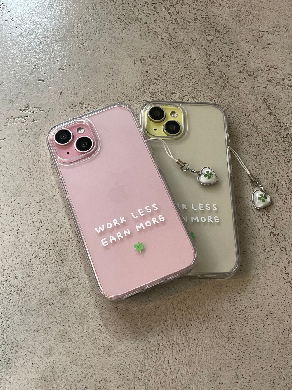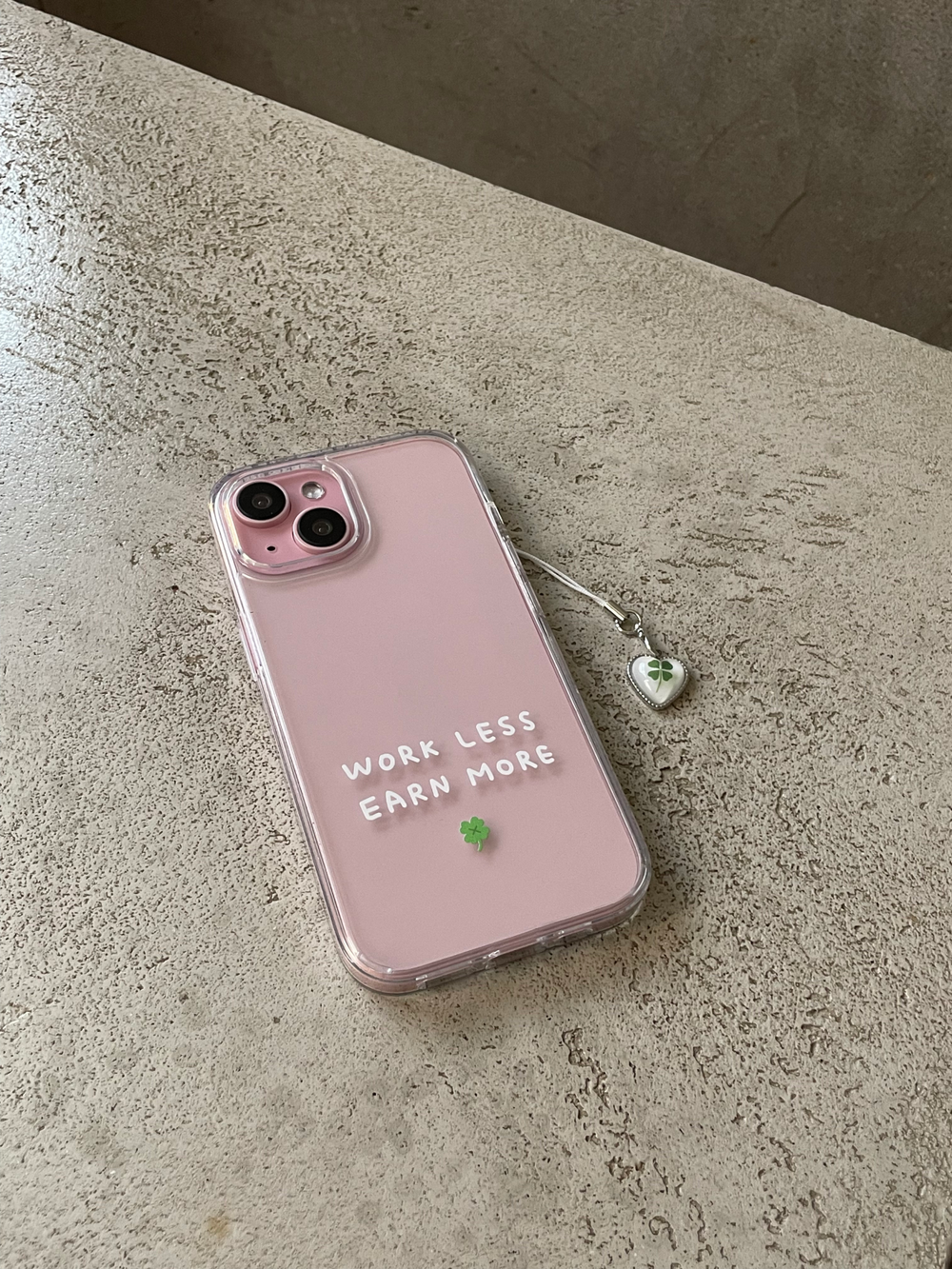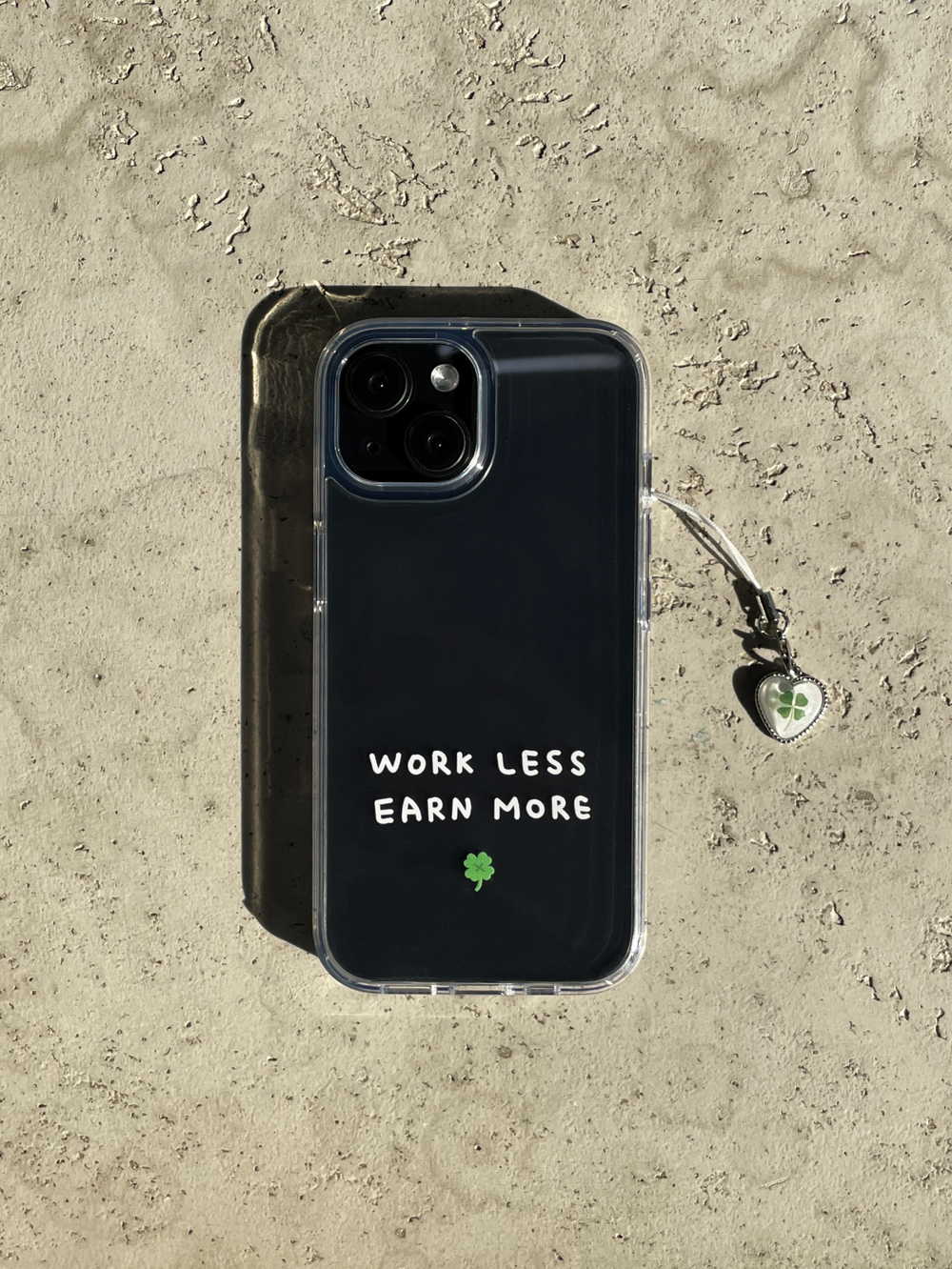 적게 일하고 많이 버세요..! WORK LESS EARN MORE 케이스와 하트 네잎클로버 키링이 세트로 구성된 상품입니다..💌